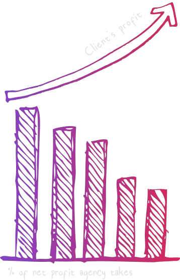 Our model is designed for transparency and long-term success. Instead of a fixed cost per client attracted, we ask for a dynamic share of the net profit generated by those clients, binding our success. This share decreases as your net profit increases, ensuring that we grow together.